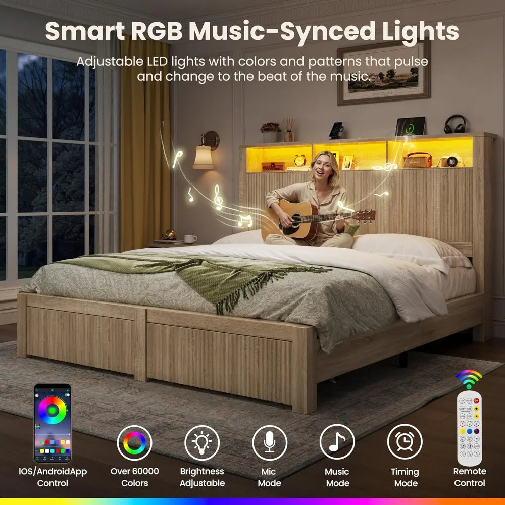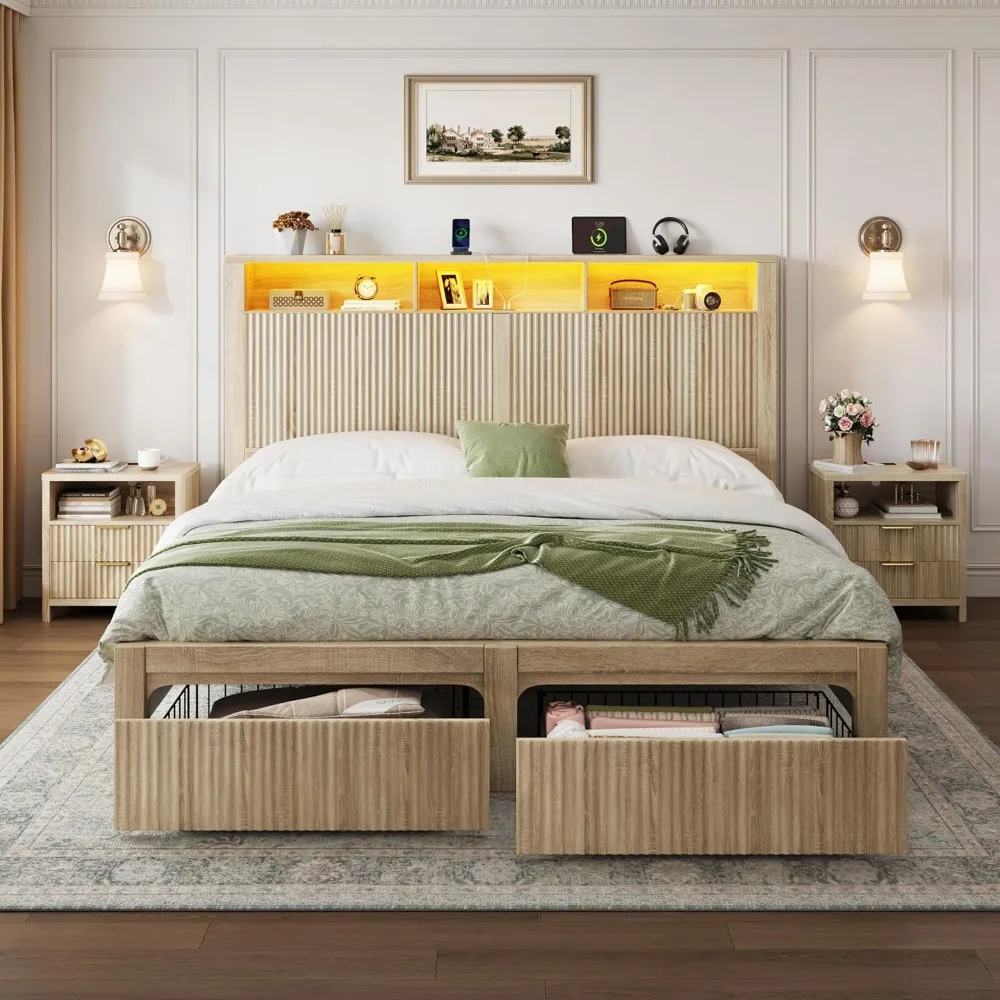 Bed Frame with Headboard and Storage Drawers, Bed Frame with LED Light and Charging Port, Wavy Wood Grain Design